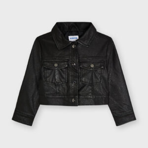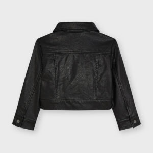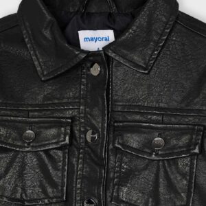 Long sleeved Jacket with buttoned cuffs for Girl 2 to 9 years. Shirt collar. Snap-button fastening on the front. Modern leatherette exterior.