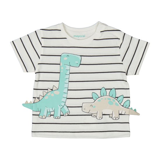 Short-sleeved t-Shirt in grey stripe with front Dinosaur print and fun 3D tail detail. Shoulder fastening.