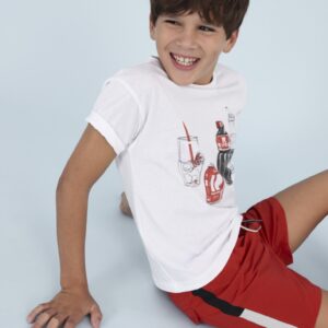 Short dungarees for boy. Waistband with adjustable inner drawstring. Functional back pocket.