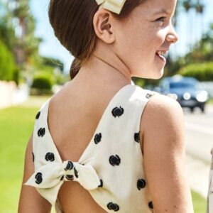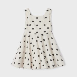 Dress with braces for girl. Square collar. Designed with opening on the back. Decorative elements: bow applique. Patterned design.