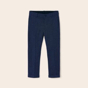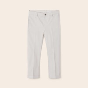 Boy’s long straight-cut chino trousers in soft, slightly stretchy fabric. Zip and button to fasten. Adjustable elasticated waistband to fit the waistline perfectly. Fresh and contemporary fabric with linen. Upturned hem. Functional pockets on the front and back of the item