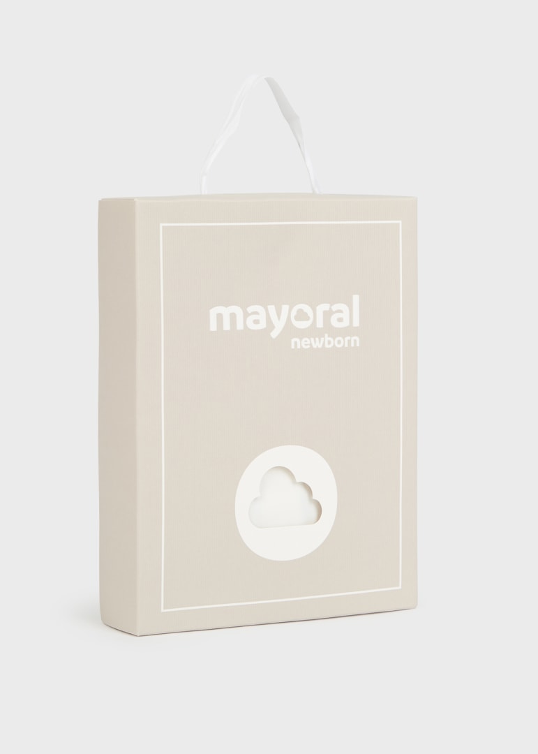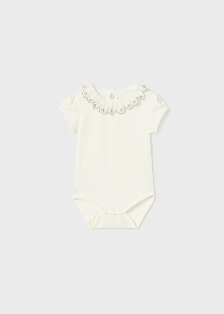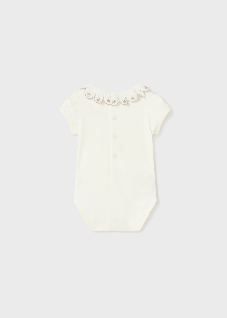 ECOFRIENDS garment, contains sustainable cotton. Short sleeved bodysuit for newborn. Round neckline with ruffles. Snap-button fastening on the back to allow the garment to be put on easily. Snap button fastening at crotch for easy dressing.