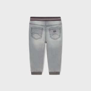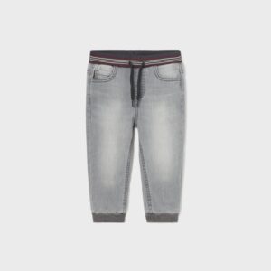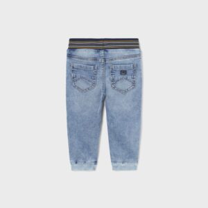 ECOFRIENDS garment, contains sustainable cotton joggers for baby, baggy at the top but narrower towards the ankle. They are perfect for sporty looks, reflecting the influence that sport has on everyday fashion. Waistband with adjustable inner drawstring. Made using modern denim fabric with a washed effect and worn finish. Functional pockets on the front and back of the item.