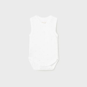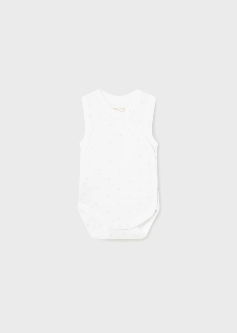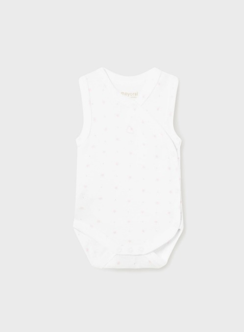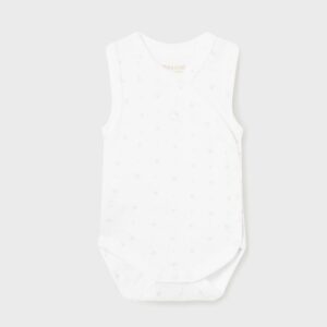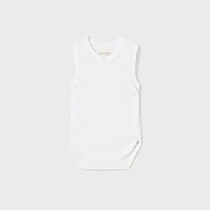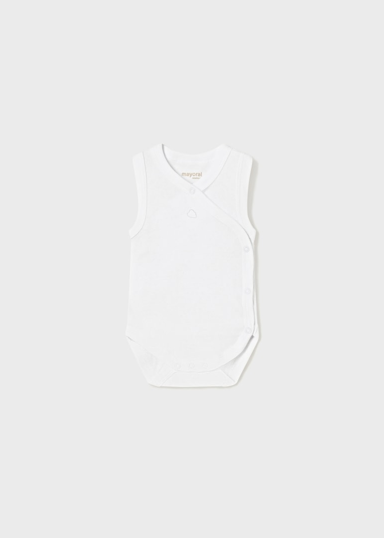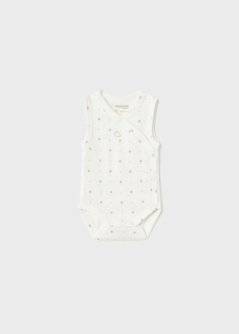 Article ECOFRIENDS 100% sustainable cotton. Sleeveless body for the newborn. Crossed collar and side opening with staple closure to facilitate body dressing.