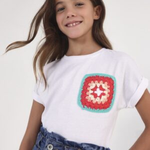 ECOFRIENDS garment 100% sustainable cotton. Short sleeved T-shirt for girl. Round neckline. Functional front pocket.