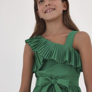 Playsuit with braces for girl. Asymmetrical neck Elastic, flowing fabric for maximum comfort on a day to day basis. Decorative elements: bow applique.