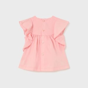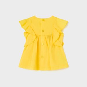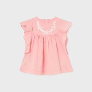 Sleeveless Blouse for baby. Round neckline. Button fastenings down the back to allow the garment to be put on and taken off easily. Made from 100% cotton fabric. Decorative elements: embroidery, decorative ruffles.