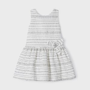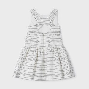 Dress with braces for girl. Round neckline. Zip fastening on the back for a quick fit. Designed with opening on the back. Decorative elements: decorative button, sequins. For safety reasons, the smaller sizes (2-3 years) may have some variations in the decorative elements used in the design.