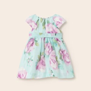 Short sleeved dress for baby. Opening on the back with an invisible zip. Elegant sash with a fastening, which is detachable from the waist. Floral pattern.