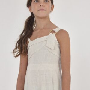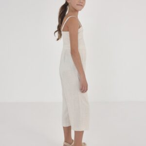 Jumpsuit with braces for girl. Asymmetrical neck Fresh and contemporary fabric with linen. This model has honeycomb detailing.