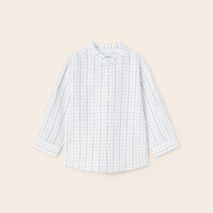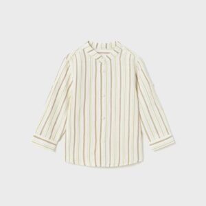 Long sleeved shirt for baby with belt loop and a button on the side to roll the sleeve up and adjust the length. Grandad collar in same colour. Button fastenings down the front. Fresh and contemporary fabric with linen.