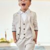 Gilet for boy. V-neck design. Button fastenings down the front. Fresh and contemporary fabric with linen. Functional front pockets.