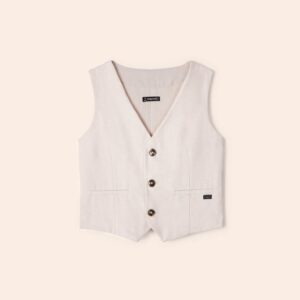 Gilet for boy. V-neck design. Button fastenings down the front. Fresh and contemporary fabric with linen. Functional front pockets.
