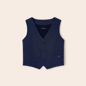 Gilet for boy. V-neck design. Button fastenings down the front. Fresh and contemporary fabric with linen. Functional front pockets.