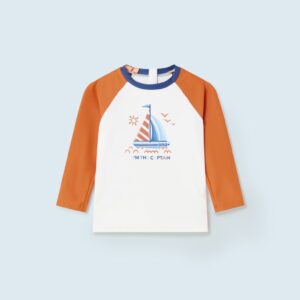 Long sleeved T-shirt for baby. Round neckline. Button fastenings down the back to allow the garment to be put on and taken off easily. Patterned design.