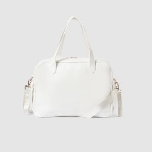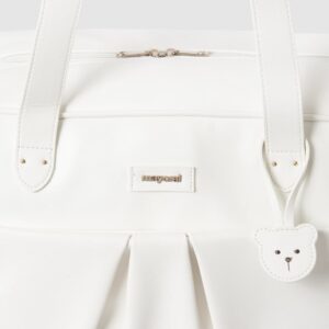 Spacious maternity bag used to help you on a daily basis and store everything you need to look after your baby. Zip fastening. Modern leatherette exterior. Includes short hand held straps which ease handling. It includes hanging straps to attach onto the pram and another long strap so that the bag can be used as a shoulder bag too. Both of these straps are detachable. Decorative hanging detailing. This design incorporates interior pockets which allow better organization.