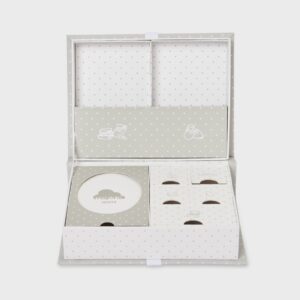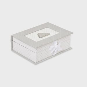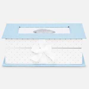 Original baby memory box with varying sizes of internal compartments where you can keep valuable objects from the most special moments of your little one´s life. Decorative elements: bow applique. Polka-dot pattern.