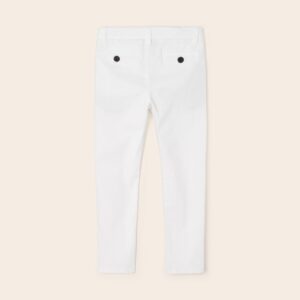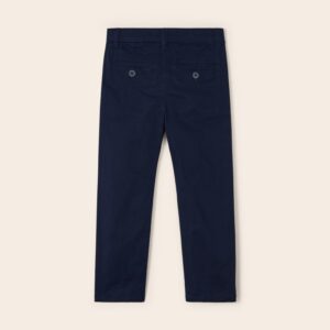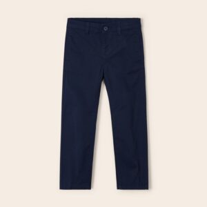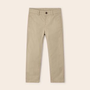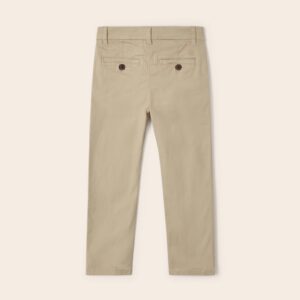 ECOFRIENDS garment, contains sustainable cotton. Straight cut chino style trousers for boy, perfect for dressier occasions. Zip and button to fasten. Adjustable elasticated waistband to fit the waistline perfectly. Made from comfortable and resistant twill fabric. Functional pockets on the front and back of the item.Â