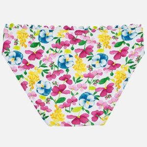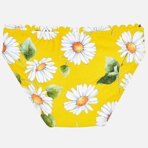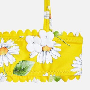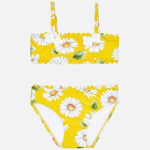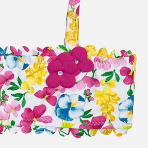 Bikini with straps for girl. Made using elasticated fabric for maximum comfort on a day to day basis. Decorative elements: floral applique. Floral pattern.