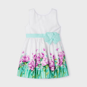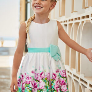 Dress with braces for girl. Round neckline. Zip fastening on the back for a quick fit. Made from 100% cotton fabric. Decorative elements: applique bows. Floral pattern.