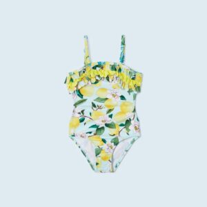 Swimwear with braces for girl. Elastic, flowing fabric for maximum comfort on a day to day basis. Decorative elements: decorative ruffle. Patterned design.