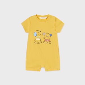 Short sleeved romper for newborn. Side fastening with press studs. Snap button fastening at crotch for easy dressing. This item comes presented in a box from the Newborn collection, ideal to be given as a gift on special occasions.