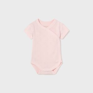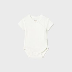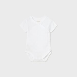 ECOFRIENDS garment 100% sustainable cotton. Short sleeved bodysuit for newborn. Crossover neckline and full side slit that closes with snap buttons to make it easy to put the bodysuit on.