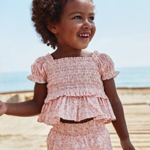 Short sleeved Blouse for baby. Square collar. Made from 100% cotton fabric. Decorative elements: puckered details with smocking stitching. Patterned design.