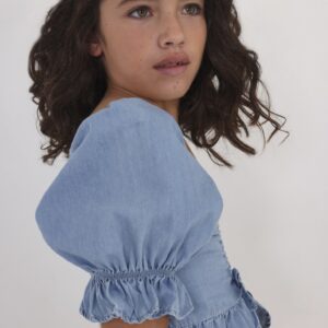 Short sleeved blouse with ruffled detailing for girl. Square collar. Made from 100% cotton fabric. Design with a decorative ruffle at the bottom of the item. Decorative elements: bow applique.
