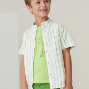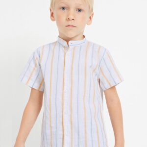 Short sleeved shirt for boy. Grandad collar in same colour. Button fastenings down the front. Striped pattern.