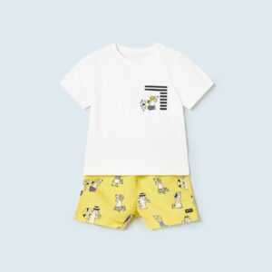 ECOFRIENDS garment 100% recycled polyester. Short dungarees for baby. Waistband with adjustable inner drawstring. Patterned design.