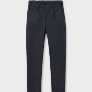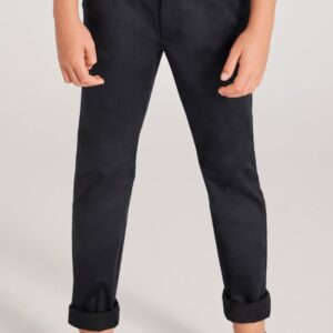 Chino style trousers for boy with a skinny, elegant fit. Zip and button to fasten. Adjustable elastic with buttons on the inside of the waistband for a better fit.Â