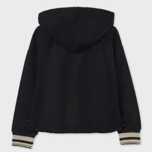 Long sleeved Hoodie with contrasting coloured elasticated cuffs for Older girls from 8 to 16 years. Hooded collar. Front, central zip fastening. Adjustable elastic at the bottom of the item to adjust the sizing.