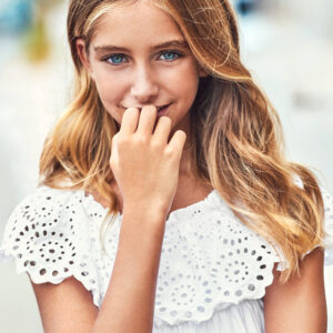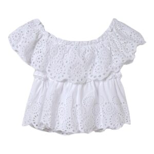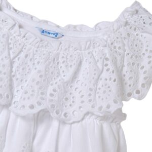 Mayoral blouse. White. Embroidered knitted fabric and openwork. Shoulders with flight. Steering wheel on top. Round neck.