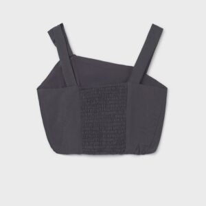 Strappy top for girl. Asymmetrical neck Fresh and contemporary fabric with linen. Decorative elements: Smock stitch ruffled details (honeycomb knit), Bow. Plain design.