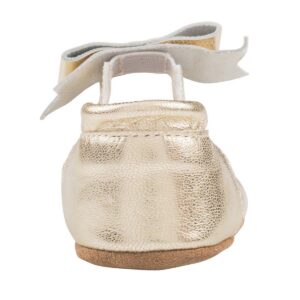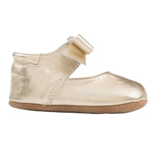 Gold metallic leather Mary Jane with 3D bow and suede sole. Flexible soles and cushioned foam insoles provide protection and comfort for healthy foot growth. Elasticized ankle design ensures they stay on little feet. Runs true to size.