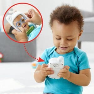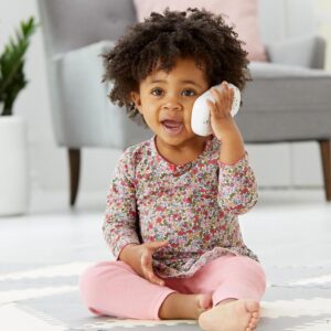 Baby’s first selfie! Thanks to its mirrored surface, this adorable toy phone encourages self-recognition at playtime. Three light-up face filters are fun for little ones to explore—from goofy glasses to cute dog ears and more. Awesome sound effects, including barks and meows plus cheerful tunes add to the fun!