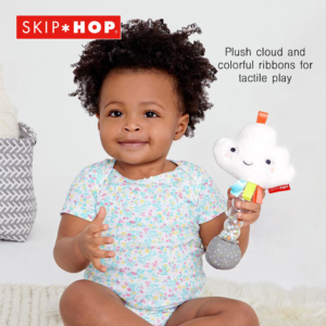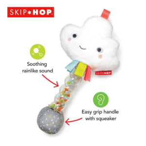 Easy for little hands to grab and shake, our adorable rain stick rattle makes soothing pitter-patter raindrop sounds little ones will love. With a plush cloud and colorful ribbons for tactile exploration, it also features a fun raindrop squeaker ball at the handle base for baby to discover. Coordinates with the Silver Lining Cloud collection.