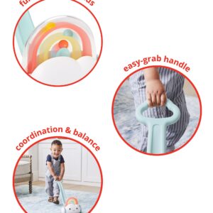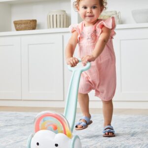 A classic push toy with a rainbow-bright twist, our cute and colorful design encourages baby’s first walking adventures. With every step baby takes, a rainbow with colorful balls rewards baby with fun popping sounds. A great way to build walking confidence, gross motor skills, balance and more at playtime.