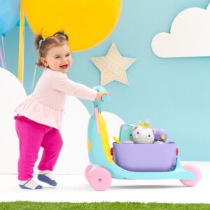 Designed to grow with your little one for three stages of fun, Skip Hop’s cute and colorful Ride-On Toy offers an entertaining way to encourage motor skills development, balance and coordination at playtime. Stage one, designed for early walkers, motivates little ones to push and pull in wagon mode—a great spot for favorite toys, too. At stage two, the wagon’s storage tub converts to a seat for ride-on mode. Ready for stage three? Just remove the seat, pull up the adjustable handle for your toddler, hop on the scooter and take it for a spin! They’ll love pressing the button at the front for a headlight, melodies, a beep sound and more fun sound effects as they whizz along.