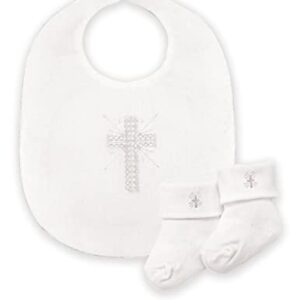 Stephan Baby’s beautiful Keepsake Embroidered Cross Bib and Bootie Socks are as sweet and pure as the little ones who will wear them. But babies have been known to be a festival of splurts and splats – even on special occasions – so Stephan Baby knows that your little one just might need a bib to protect his or her delicate attire. The exquisite little bib is woven of crisp white 100% cotton and is beautifully embroidered with a satiny white cross; ample space below the cross allows for personalization, and the bib’s dainty button-back closure adds an elegant touch. The soft knit bootie socks feature a petite embroidered cross and generous fold-over cuffs. And, if you’re thinking that a Keepsake Embroidered Cross Bib and Bootie Socks set would make a lovely shower, Christening or Baptism gift, you’ll be delighted to find that it arrives nicely presented in a clear gift box. Since 1987, Stephan Baby has been dedicated to fine quality, unique and heartwarming gifts that celebrate the magic of baby’s first year. The Stephan Baby family invites you to discover their inspired collections of blankets, gift sets, charming apparel and accessories, beautiful keepsakes. All Stephan Baby products are CPSIA tested and approved.