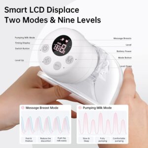 【Smart Adjustable Breast Pump Suction】The wearable breast pump electric has 2 modes.Portable Breast pumping mode Imitating the baby’s actual sucking frequency.Massage mode stimulate breasts before pumping to help fast sucking,comfortable & pain-free.Easily to find the right suction power to help you get more milk in shorter time gives new mom more choice and comfort.LCD screen for easy operation with 9 Adjustable intensity levels,memory function and 30 minutes timed turn off.